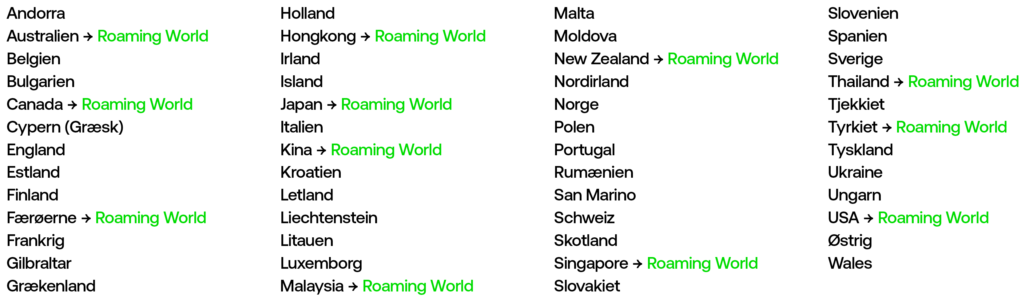 Du får dækning i 51 lande, der gør det muligt for dig at bruge mobilen i 39 europæiske lande, USA, Thailand, Tyrkiet og mange flere med Roaming World.